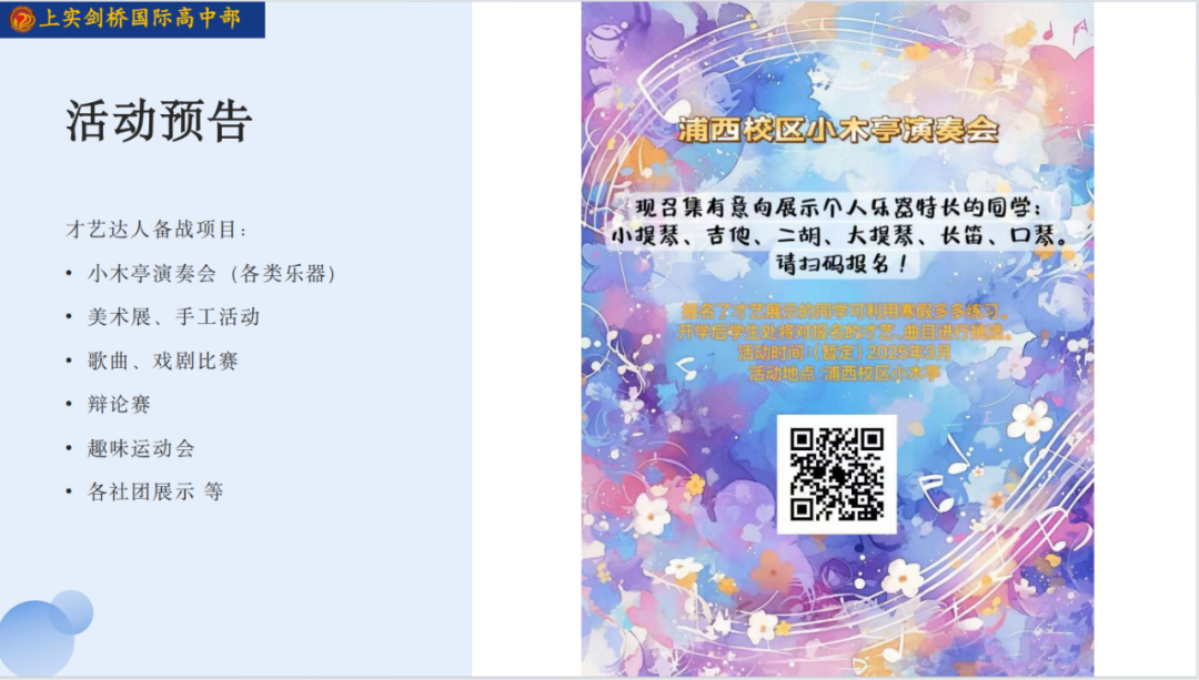 旧岁已展千重锦,新年再进百尺竿。2025年,愿每一位上实剑桥人继续以“松静匀乐”的状态,在探索与创造中书写属于自己的成长诗篇。新学期,我们更高处见!