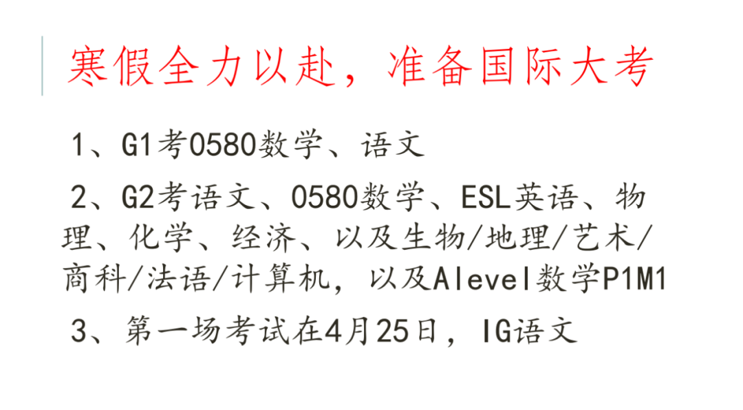 寒假期间,同学们更应抓紧不多的时间,用心准备即将到来的大考,为自己制定一条升学规划线,以积极饱满的状态迎接每一场考试,做到自己的最好程度,A部尤其是A1的同学们,要更加主动地在假期中了解心选院校及专业的申请要求,争取预估达标,阅读相关的大学推荐书目,拓展个人视野,做好充分的准备,尝试自己撰写文书。祝愿同学们再创佳绩,以崭新的姿态迎接接下来的挑战。