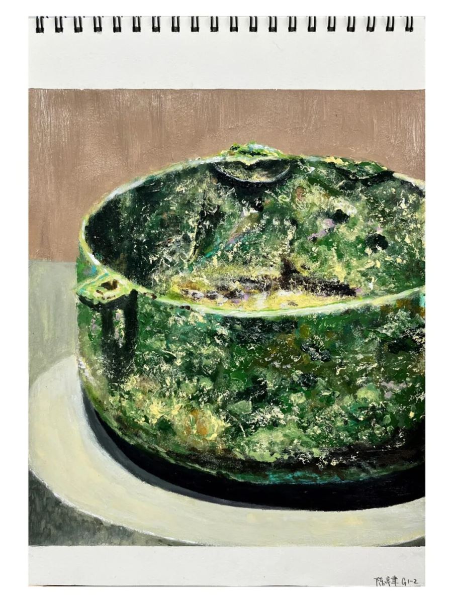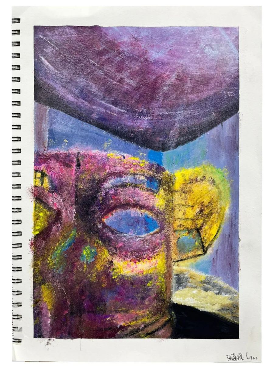 参观了上海博物馆。在3D影院里,我被这躲在角落里披着薄纱、黯然出彩的肖像所吸引。它呈暗紫色,随着周围的灯光变幻着,我拿手机记录下了这美妙氛围。回到学校,我便用丙烯在画纸上描绘下了这光影变幻的三星堆作品。