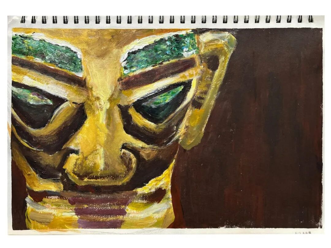 在参加了这次三星堆展览我拍下了这幅薄金面具,上面的蓝绿点缀吸引了我,我想通过丙烯表现出上面的光影