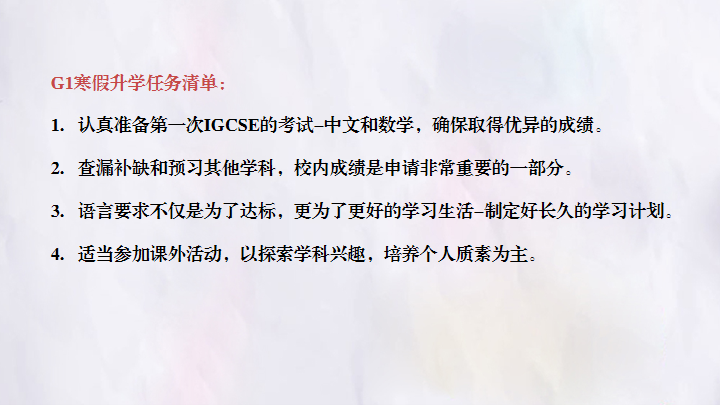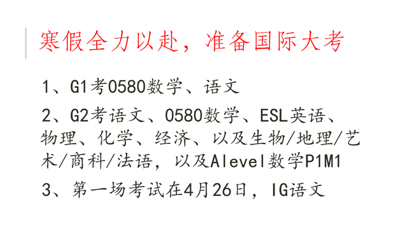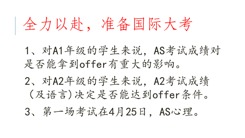 下学期的时间十分紧张,并且很多学校的热门专业对IG成绩有所要求,希望各位同学在寒假能全力以赴,准备国际大考。郑校也以IG物理为例指导G部同学如何学习。对A1年级的学生来说,AS考试成绩对是否能拿到offer有重大的影响。对A2年级的学生来说,A2考试成绩(及语言)决定是否能达到offer条件。