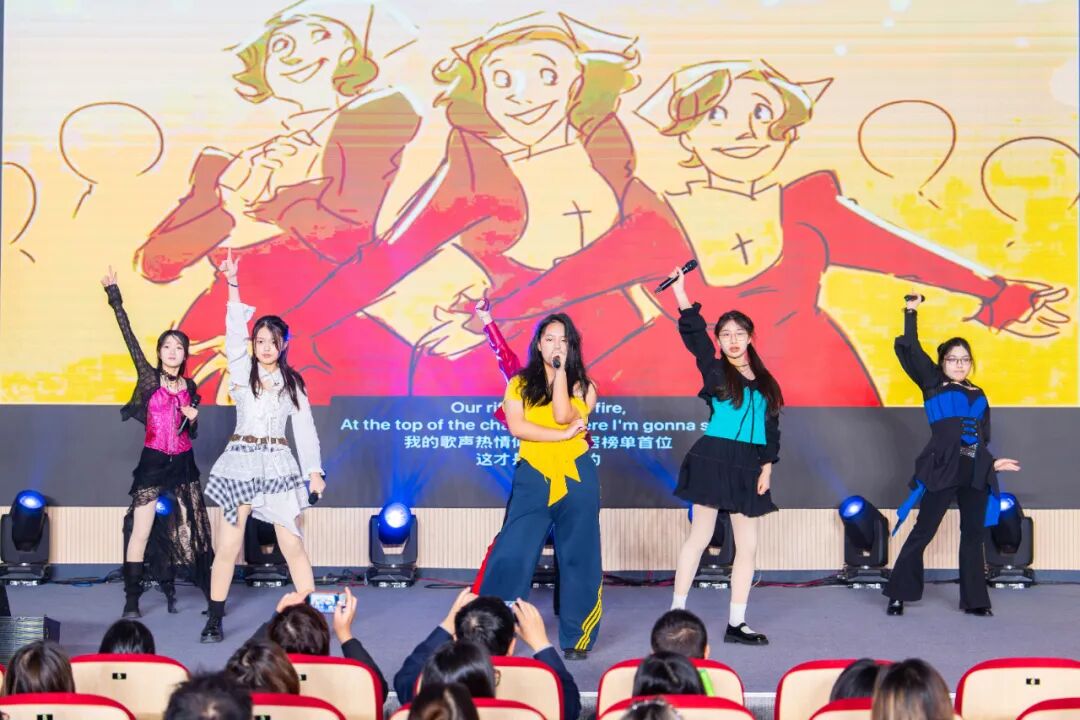 随后,舞台穿越回英国都铎王朝。汪欣怡、范羽嘉、潘亦瑶、王晗龄、张芳瑜、顾昕媛六位同学,化身亨利八世的六位王后,为历史中的女性发出自己的声音。强烈的节奏、富有张力的表演,让这部音乐剧焕发出全新的生命力。