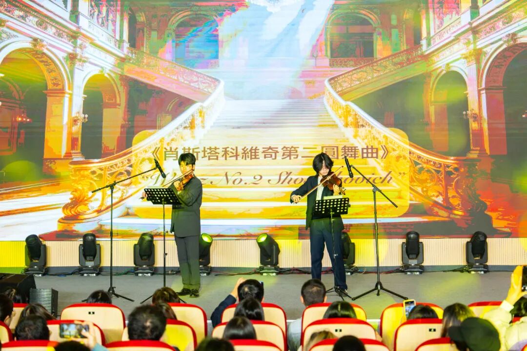 晚会迎来了一个小高潮——数学组李俊康老师惊喜登台,献唱一曲《思念是一种病》。台下反响热烈,同学们热情欢呼,纷纷为李老师“打call”!A1-2班邢高境与胡凯恩同学带来小提琴合奏《肖斯塔科维奇第二圆舞曲》。悠扬典雅的弦乐在礼堂回荡,不仅展示了他们扎实的演奏功底与艺术修养,更带领大家沉浸于古典音乐的永恒魅力之中。