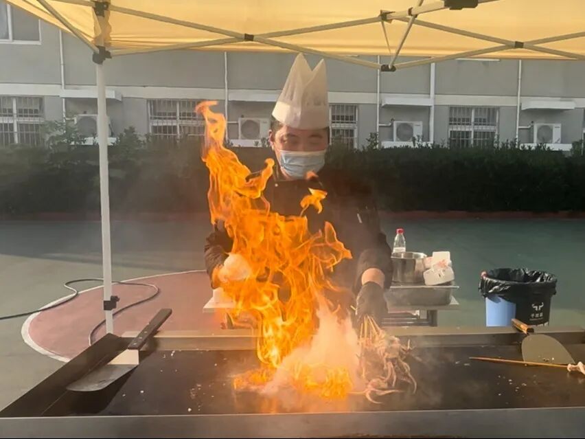 铁板上的鱿鱼滋滋作响,熊熊火焰瞬间喷涌而起,令在场的同学们无不叹为观止!这不仅是一次铁板美食的制作,更是一场激情四溢的表演。鱿鱼在高温的炙烤下,散发出阵阵诱人的香气。那独特的味道,仿佛在诉说着大海的故事。