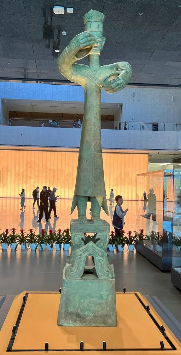 进入了博物馆,看到各式各样的三星堆,铜罐。这个青绿色的三星堆包裹住了我的眼球。宽大的脸庞从正面看去相当立体,高挺的鼻梁,土黄色与青绿色的渲染使三星堆变得更加完美。
