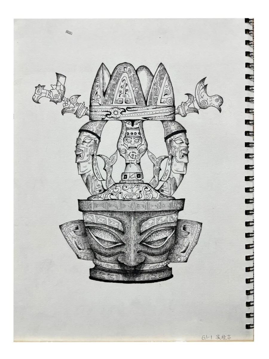 我的目标是能着重突出三星堆文物的纹路。带着这个目标,我着重拍摄了文物的纹路并仔细挑选,选用针管笔很好地重现了这些纹路。