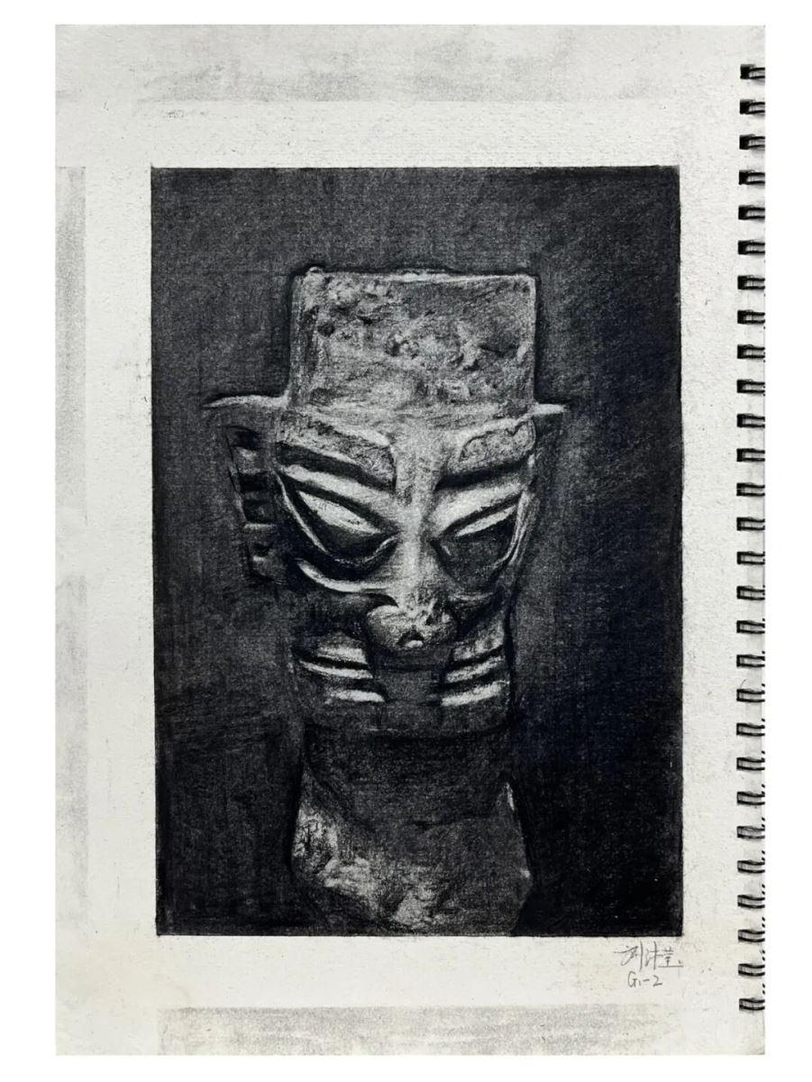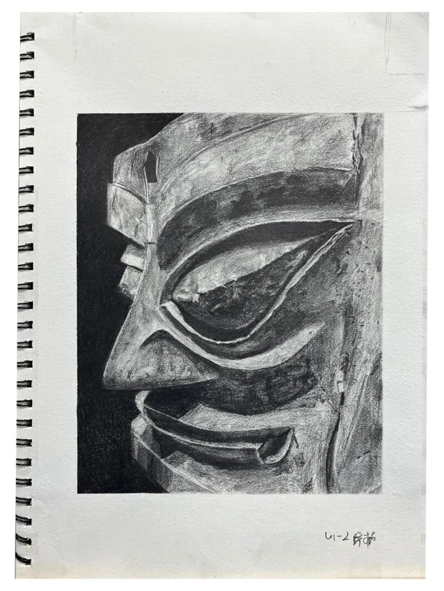 三星堆的文物蕴藏着古人的智慧。精美的外观以及岁月留下的斑驳,在灯光的映照下格外分明。我认为使用素描的黑白关系,更能表现其细节与明暗。