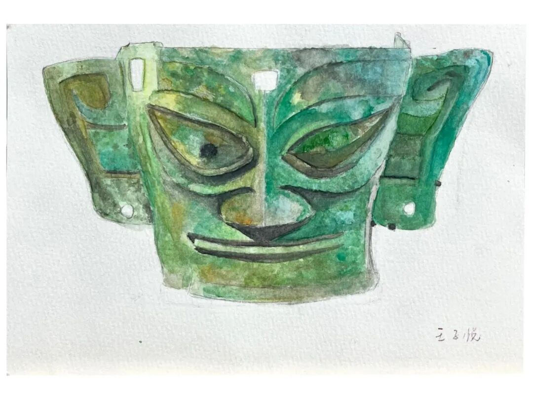 在参加了这次三星堆展览我拍下了这幅薄金面具,上面的蓝绿点缀吸引了我,我想通过丙烯表现出上面的光影