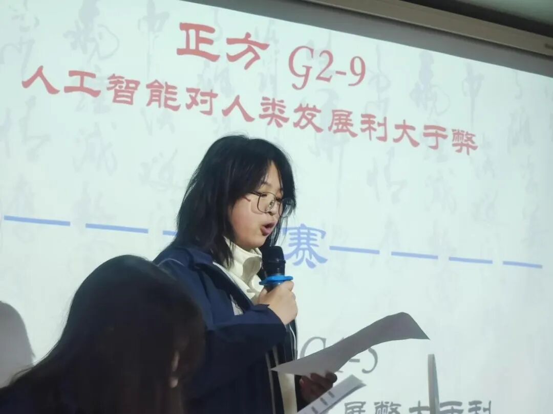 在最终的冠军争夺赛中,G2-9和G1-5班的同学围绕“人工智能对人类发展是利大于弊还是弊大于利”这一热点议题展开激烈辩论。双方队伍各展所长,精彩场面层出不穷,辩手们思路清晰、言语犀利,展现出了超凡的辩论技巧与思考能力。观众们纷纷为辩手们加油,为这场精彩的思想交锋喝彩。