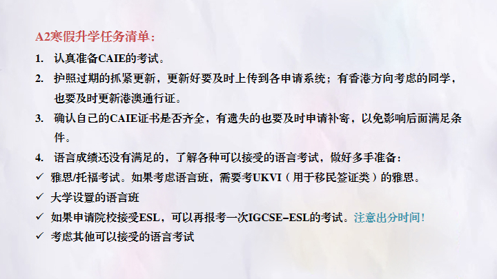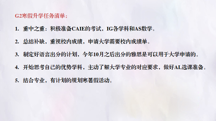 下学期的时间十分紧张,并且很多学校的热门专业对IG成绩有所要求,希望各位同学在寒假能全力以赴,准备国际大考。郑校也以IG物理为例指导G部同学如何学习。对A1年级的学生来说,AS考试成绩对是否能拿到offer有重大的影响。对A2年级的学生来说,A2考试成绩(及语言)决定是否能达到offer条件。