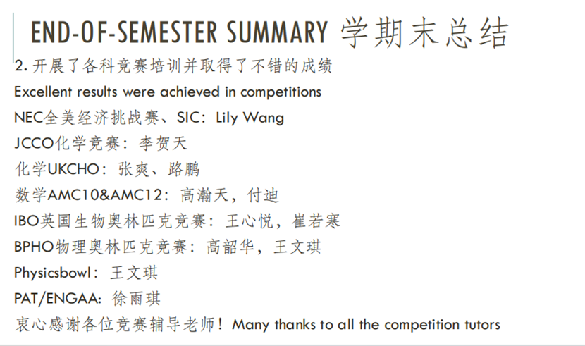 郑校长总结了本学期学校开展的各项活动。本学期10月份举行了公开课活动,为各位老师提供展示自己教学风格的平台,同时也鼓励各位老师抱有一颗学习的心,互相学习,互相借鉴。本学期学科竞赛取得了不错的成绩,这也离不开各位竞赛辅导老师的辛勤工作,为优秀的同学拓宽知识面,加深对学科知识的理解。