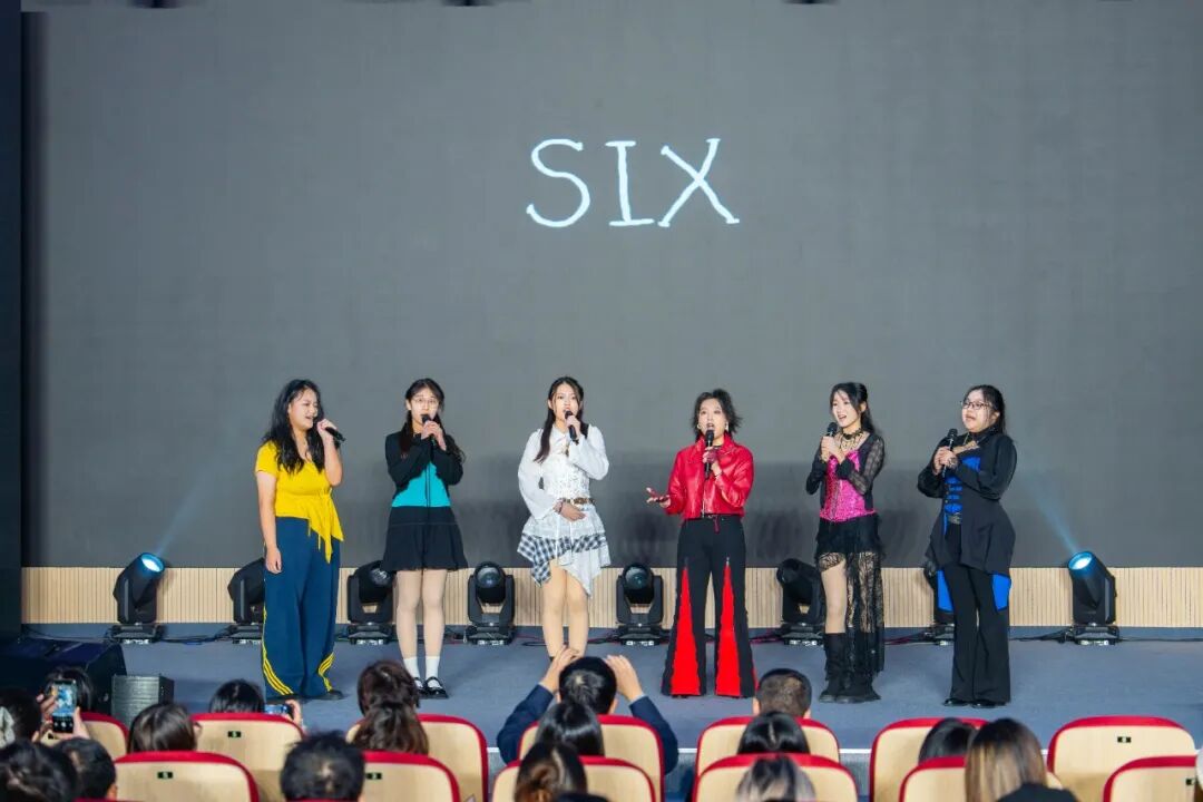 随后,舞台穿越回英国都铎王朝。汪欣怡、范羽嘉、潘亦瑶、王晗龄、张芳瑜、顾昕媛六位同学,化身亨利八世的六位王后,为历史中的女性发出自己的声音。强烈的节奏、富有张力的表演,让这部音乐剧焕发出全新的生命力。